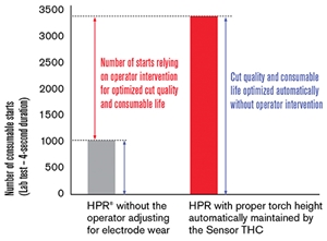 Los controles de altura de la antorcha convencionales exigen a los operadores ajustar periódicamente el voltaje del arco para asegurar la debida altura de corte. Con técnicas de propiedad exclusiva de Hypertherm, el Sensor THC muestrea continuamente el voltaje del arco y lo ajusta automáticamente para lograr la debida altura de antorcha por toda la duración de los consumibles, sin intervención del operador.