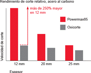 • Concluye los trabajos más rápido con velocidades de corte una y media veces mayores que las del oxicorte en acero al carbono de 12mm (1/2pulg.).
