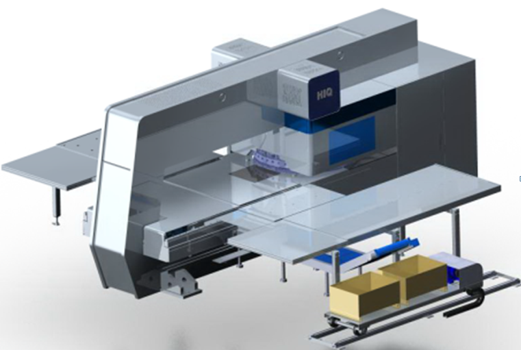 High-efficiency electric servo punch head, can reach 2000 cpm. Automatic chip collection is supported. Independent drive for upper and lower turrets, easy to change toolings. Big storage of toolings: 64 stations. Extension with automatic system is supported.